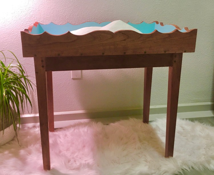 But that first whack was personally distressing! The “perfection” of the piece was now defined by how well I made it imperfect. Gouging, hammering, and throwing a chain at a piece of furniture was something I had not needed before for my own work. It was actually enjoyable when I got in the swing of things. In the end, I believe the piece had a conservative yet sufficient take on the distressing. At that point I added some penciling in dents to darken them as well as some around some nails at the base of the tray, before and after the applying of the stain. A three coat application of clear shellac and then wax finished the process.
