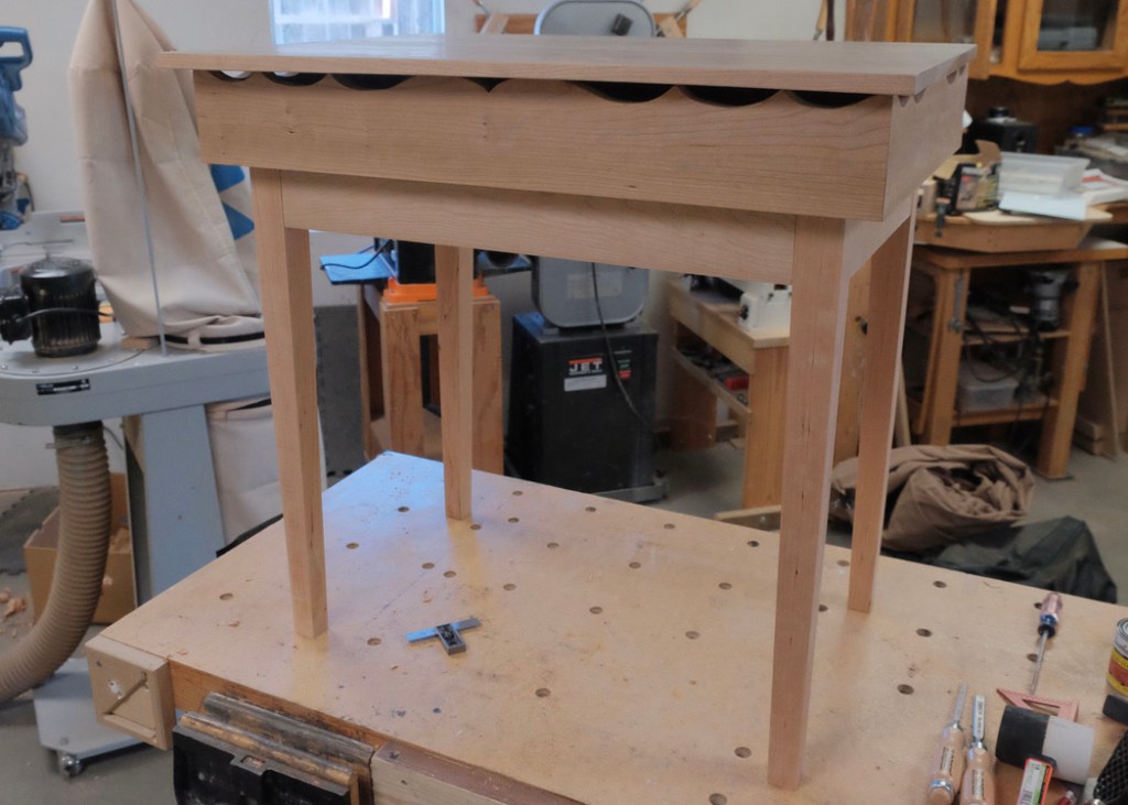 Sure enough, the build toward new perfection was easy enough. I had done it before, even though this piece had some particular design challenges that pushed my skills. One was joining a rectangular box with mitered ends. I used biscuits and glue to good effect and rabbeted the inside bottom edges for a baltic birch bottom that would not be visible. Another was doweling the mortise and tenons (something in the original) which I discovered made easier work of gluing and clamping the legs to the aprons for the base. The function and the beauty aligned well.