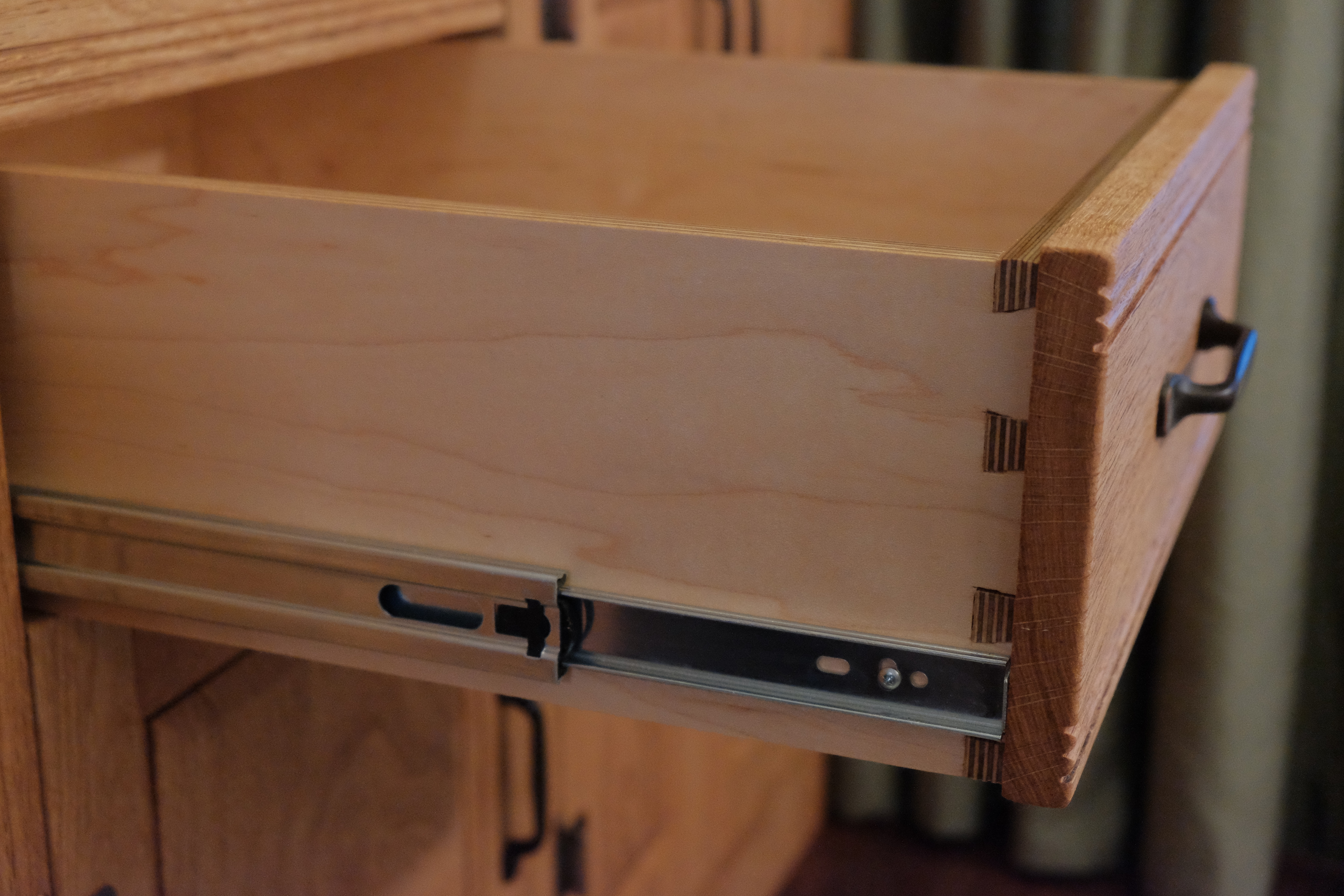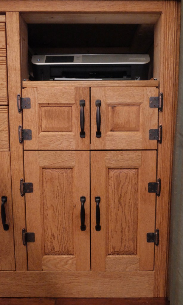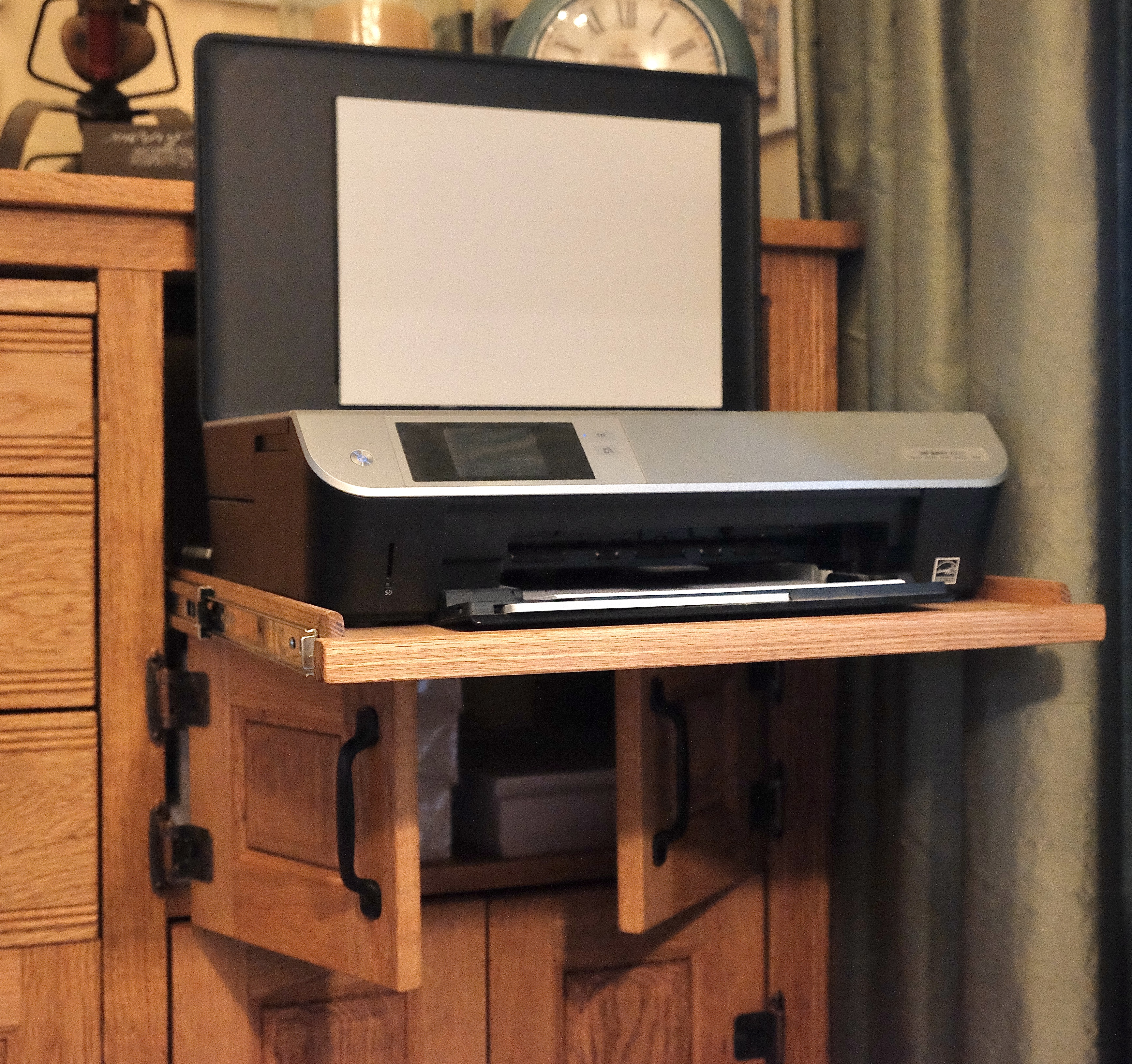 The one other functional detail I added was a pull-out shelf above the middle drawers. It will make using the file drawers easier by having a ready place to put a document for review while standing. For all drawers and the pull-out shelf for the printer, I used heavy-duty full extension drawer slides, but for this shelf, for the narrow vertical space and because it is not bearing much weight, I used a simple Euro-style slide.