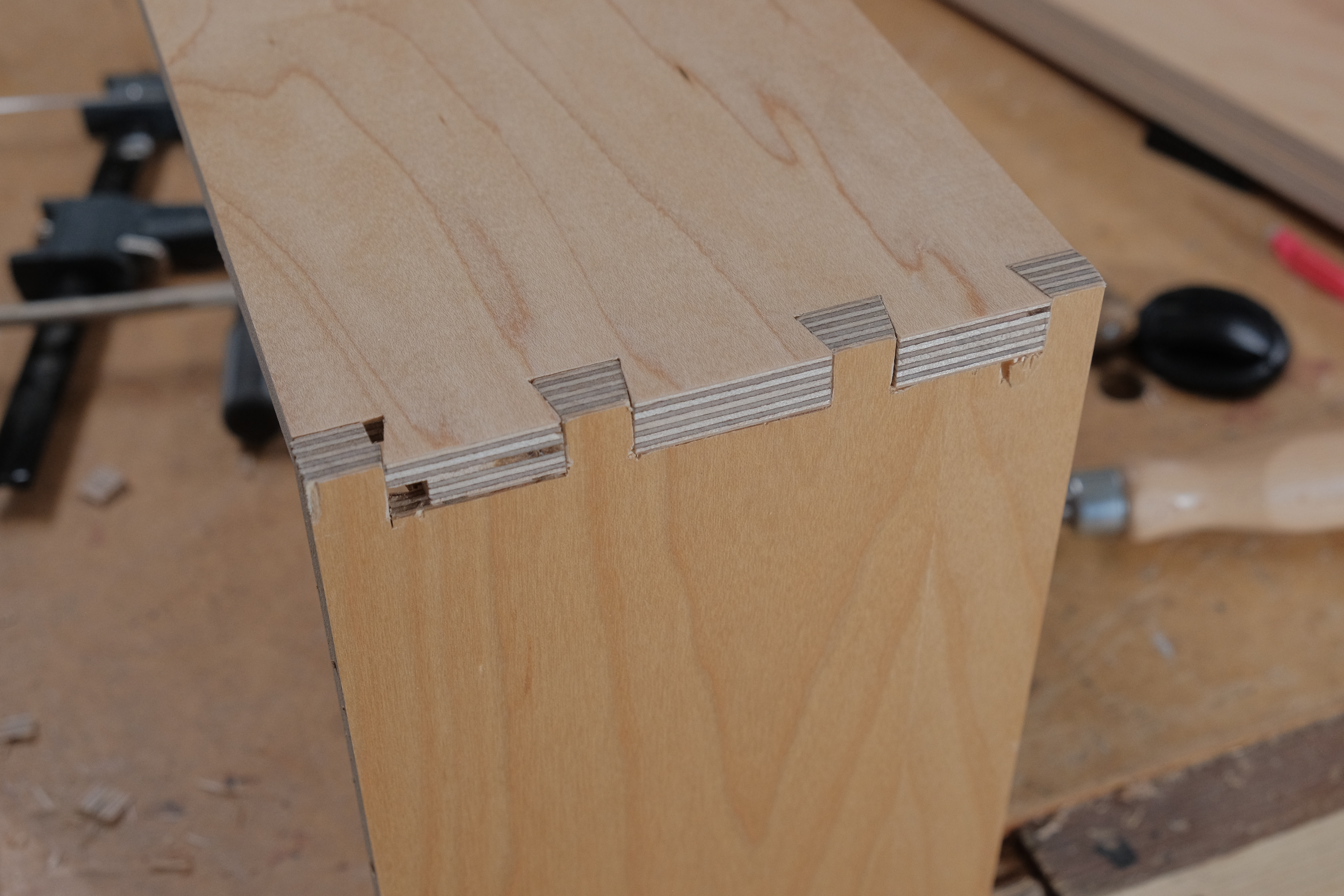 I was originally going to put a stain on, but in consultation with Lynn, I put on one of the simplest of finishes, Danish oil. It brings out the grain of the oak nicely with some warmth, but does not change the natural color much. Next to the dark finish of the piano, it actually lightens the corner the piece fits in. One nice extra is that the baltic birch plies in the dovetails pop out to the eye. Soon I’ll put on a good coat of wax. Why no poly? Since the area will not be highly trafficked there is no need. Polyurethane is nice, but actually difficult to get on perfectly in my experience. So Danish oil it is with wax.