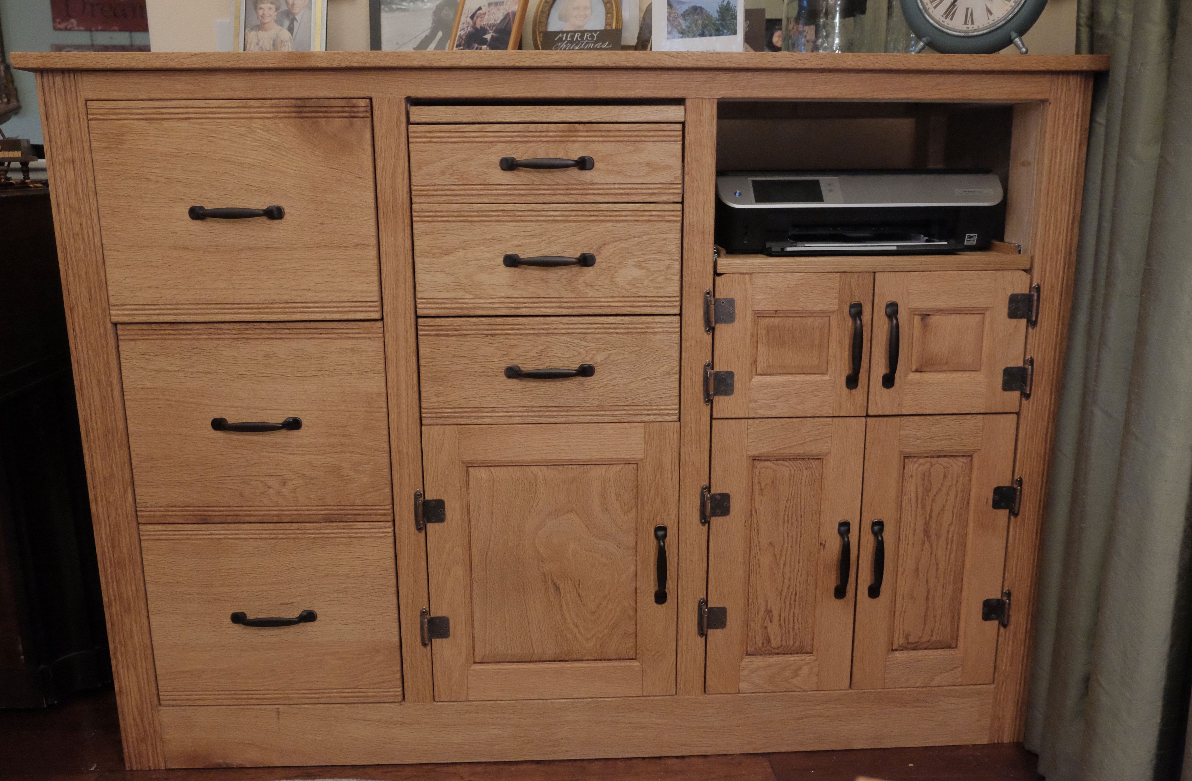 It’s done! The “Office Sideboard” project I began in late October is finished. As always, it took longer than I wanted, but mistakes happen, plans change, and all of that results in more time. Sounds like life in general. The result, however, is more beautiful and functional than I originally conceived or imagined. Some changes, particularly the adding of details and the final finish, came from asking my wife to “come look!” multiple times during the construction. Sometimes she would ask a question, other times I would ask for a preference. Since she is the end user I want her to like it most of all. I think she does.