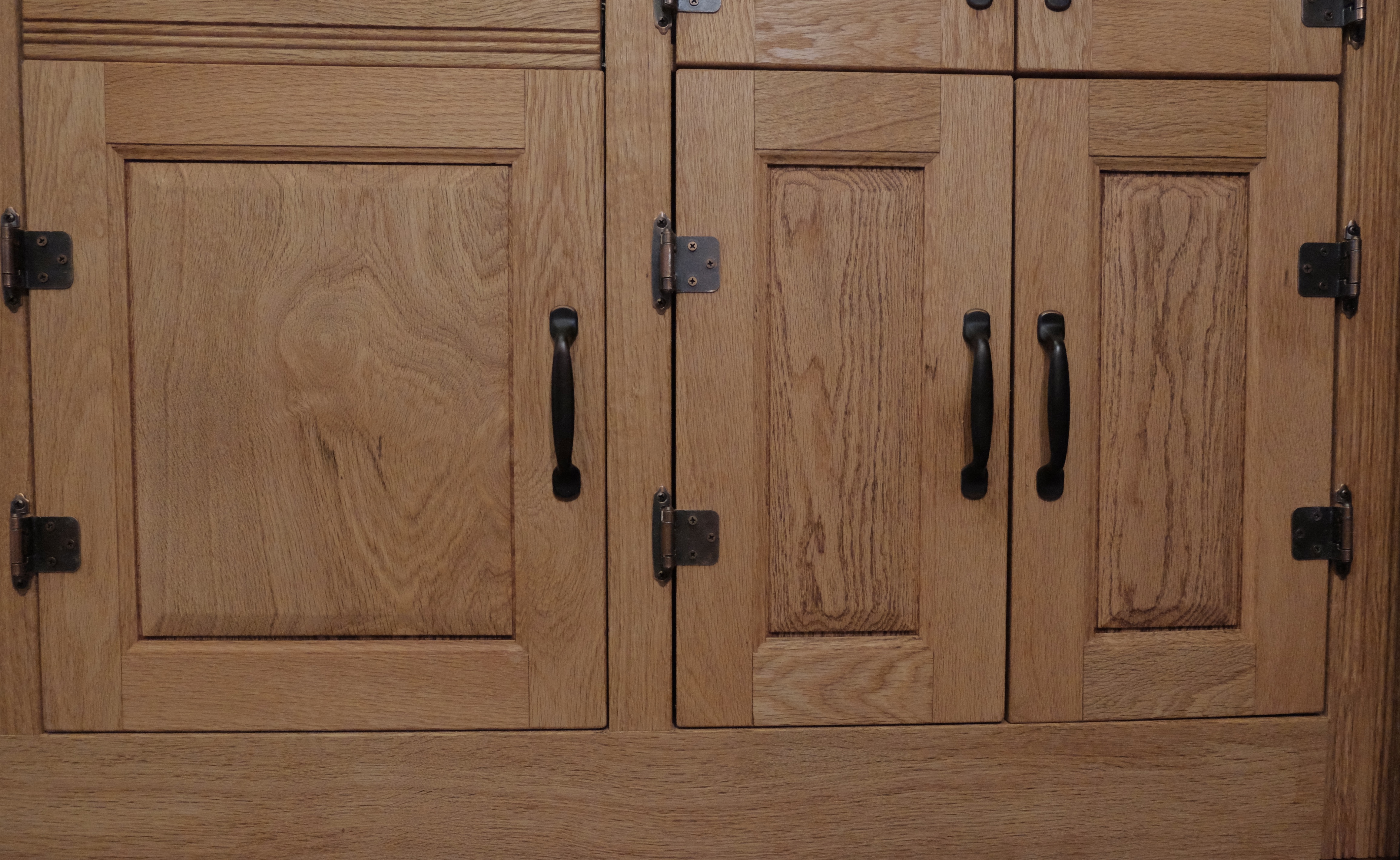 Although I had at least worked on dovetails before, I had never constructed a raised panel door. Getting the right tools and dialing those tools in for the exacting nature of the rails, stiles, and the panel was rightly intimidating. So many processes, so many opportunities to screw up! I was not disappointed in that assessment, but at the end of the day, I am delighted with the result. I picked up an inexpensive set of cabinet router bits from Harbor Freight for the doors. The bits themselves were of perfectly good quality, but the ogee panel bit was huge. Maybe it is made for actual doors that are an inch or more in thickness. I could see no way to use it for three-quarter inch stock, though I could be missing some special technique. So after getting the rails and stiles routed following a number of test cuts, I used the table saw to rabbet the panels to fit the slots, then hand-chamfered the raised panel with my Stanley 220 block plane (another favorite tool). I couldn’t be happier. Though the ogeed panel would have been nice, these have a great hand-crafted look. I ended up making five doors rather than the original three.
