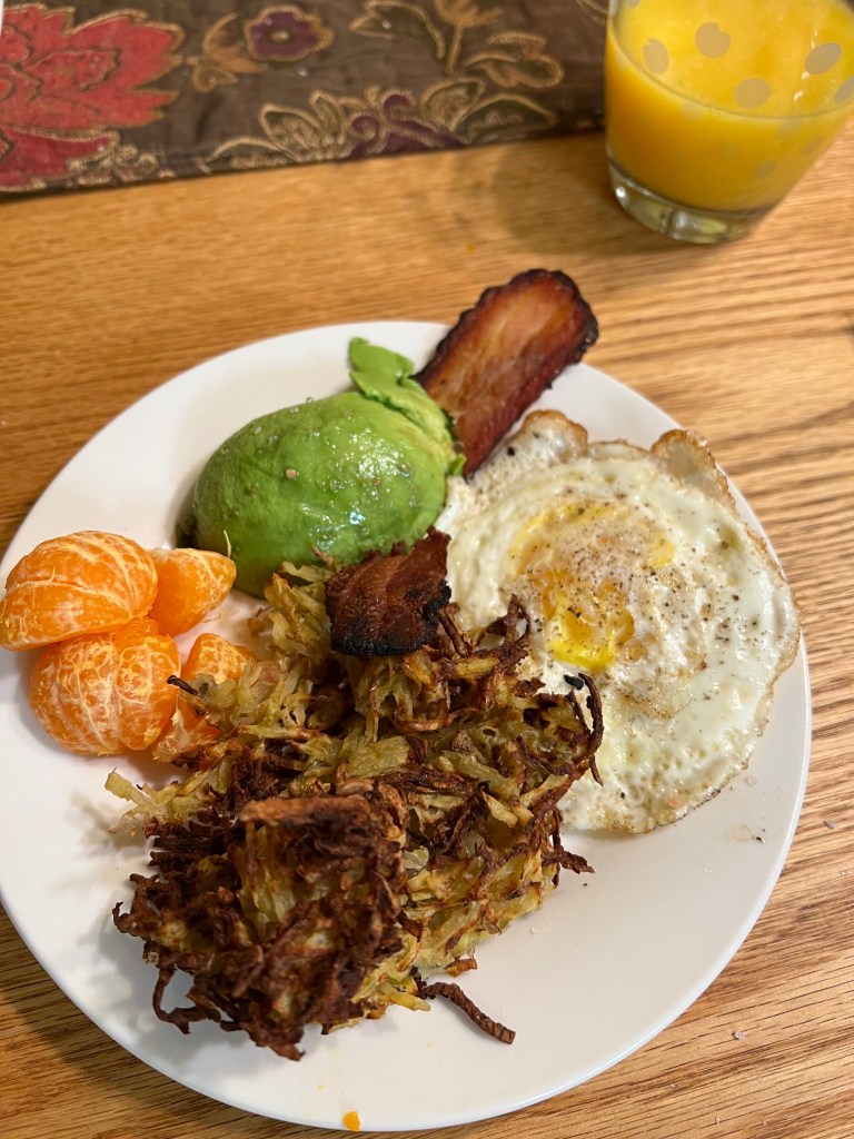 The first week, I made a sausage casserole, then tried some other template ideas. A week and a half in, breakfast became streamlined: eggs, potatoes, avocado, bacon, an orange, and orange juice. Vary the eggs (fried, poached, scrambled, boiled soft and hard) and potatoes, and breakfast is easy, tasty, and filling. Of course, the addition of the air fryer made the potatoes vastly easier and efficient, so I will continue to use it.