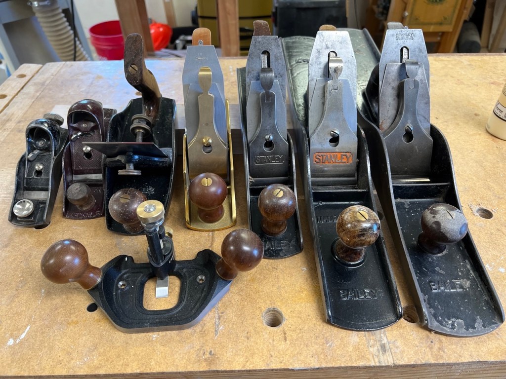 A while later I bought some cheap Bailey knock-offs from India. They never worked well and I could not figure out why. The chatter was off the charts no matter how sharp I got them. I knew I needed some better quality. Since then I have added a range of planes, not a lot mind you (unlike the shops in the You-tube videos with 50 planes on the wall!), but enough to do anything I need. Yard sales were still the go to place to find them, but I knew that Stanley planes were what to look for. I got a Stanley #8 jointing plane, a Stanley 220 block plane, a Stanley scraping plane, a Stanley low angle block plane, and some cheap no name block plane where the blade simply wedges in. Later, I picked up a Stanley #5 jack plane, and a friend gave me a Stanley #7 jointing plane. Together this suite was good, though I still needed a good quality smoothing plane and a shoulder plane. One Christmas, I asked for a Lie-Neilson #4 and, to say the least, it does the job and does so superbly. Since then I have added a Veritas large router plane and a new series Stanley Sweetheart #92 shoulder plane. I am happy with the overall combination. A fore plane would be nice, but the jack planes and the #7 fit the bill ok. Except for the new planes, all the others took a lot of elbow grease to get in good working shape.