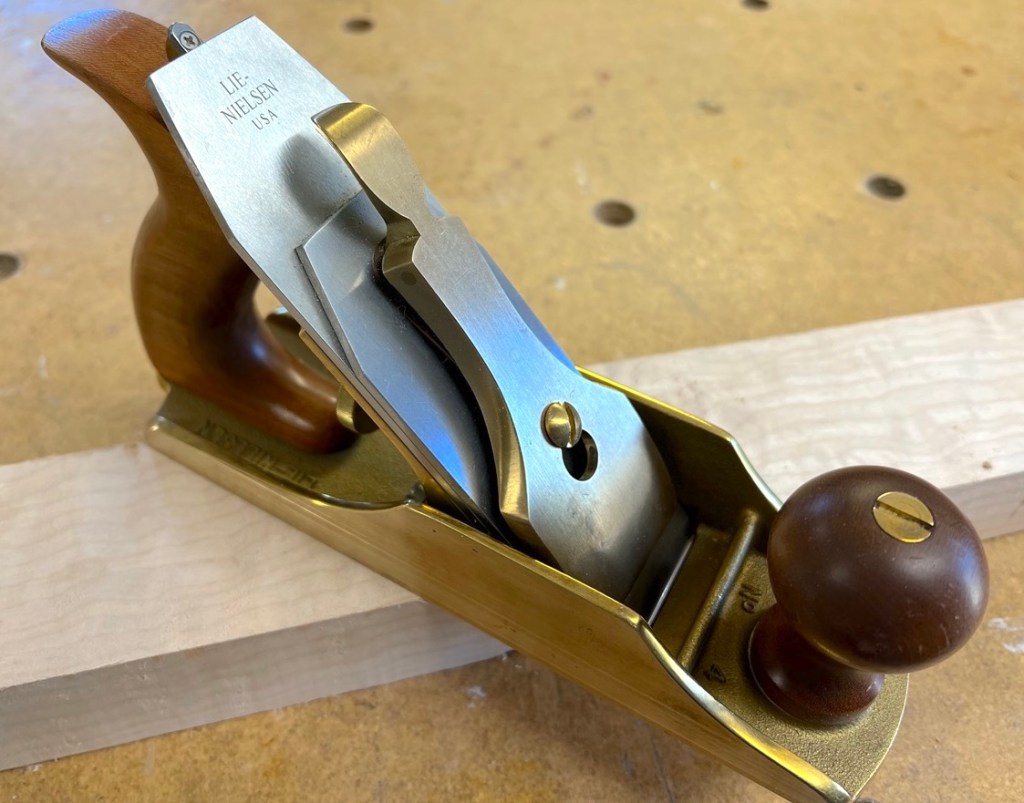 Speaking of the #4, I did not know what a truly well-made plane could do until I acquired this beautiful plane. The Lie-Neilson design is a Bailey reproduction, but with unmatched machining and quality control. I purchased the brass version which is very cool looking. Another key feature to this plane is the very thick stock blade. The mouth adjustment mechanism is the easiest of any bench plane I have used, and the horizontal adjustment has virtually no play, unlike most bench planes. It is like rack and pinion steering as opposed to the steering of so many old American vehicles that took a quarter of a steering wheel turn before the car began to follow suit (I owned a ’70 Nova for about a decade; the most egregious I experienced was my granddad’s Lincoln town car). Especially when needing very small adjustments in squaring up an edge, this feature is very helpful. And, of course, this plane makes incomparable translucent shavings that maintain their integrity instead of turning to dust, which is to me the most fun part of using a hand plane.