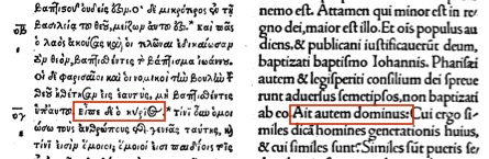 But my Greek NT showed absolutely no evidence that “And the Lord said” ever existed in any Greek manuscripts of the NT. So Monday I went on an odyssey to find out where the words came from. They were in Erasmus’s Greek text from the early 16th c., which the KJV and Luther used, as well as so many translations up to the twentieth century. But where did they come from?