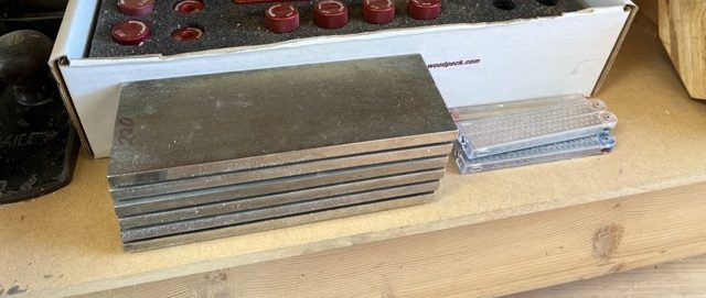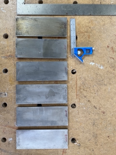 Finally, the stones stack right on one another, so are easy to store. I keep them on the shelf below my bench top. I took a red sharpie and put the grit number on the face of each stone, so I didn’t have to wonder when I pull them out. The edge does indicate the grit and correct side, but the sharpie makes things clearer.