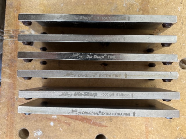 A few years ago, I picked up a cheap four-sided diamond sharpening contraption that went from 200-600 grit. It was too short and narrow, but I liked the easy maintenance. I thought I might like to consider something like it in the future.