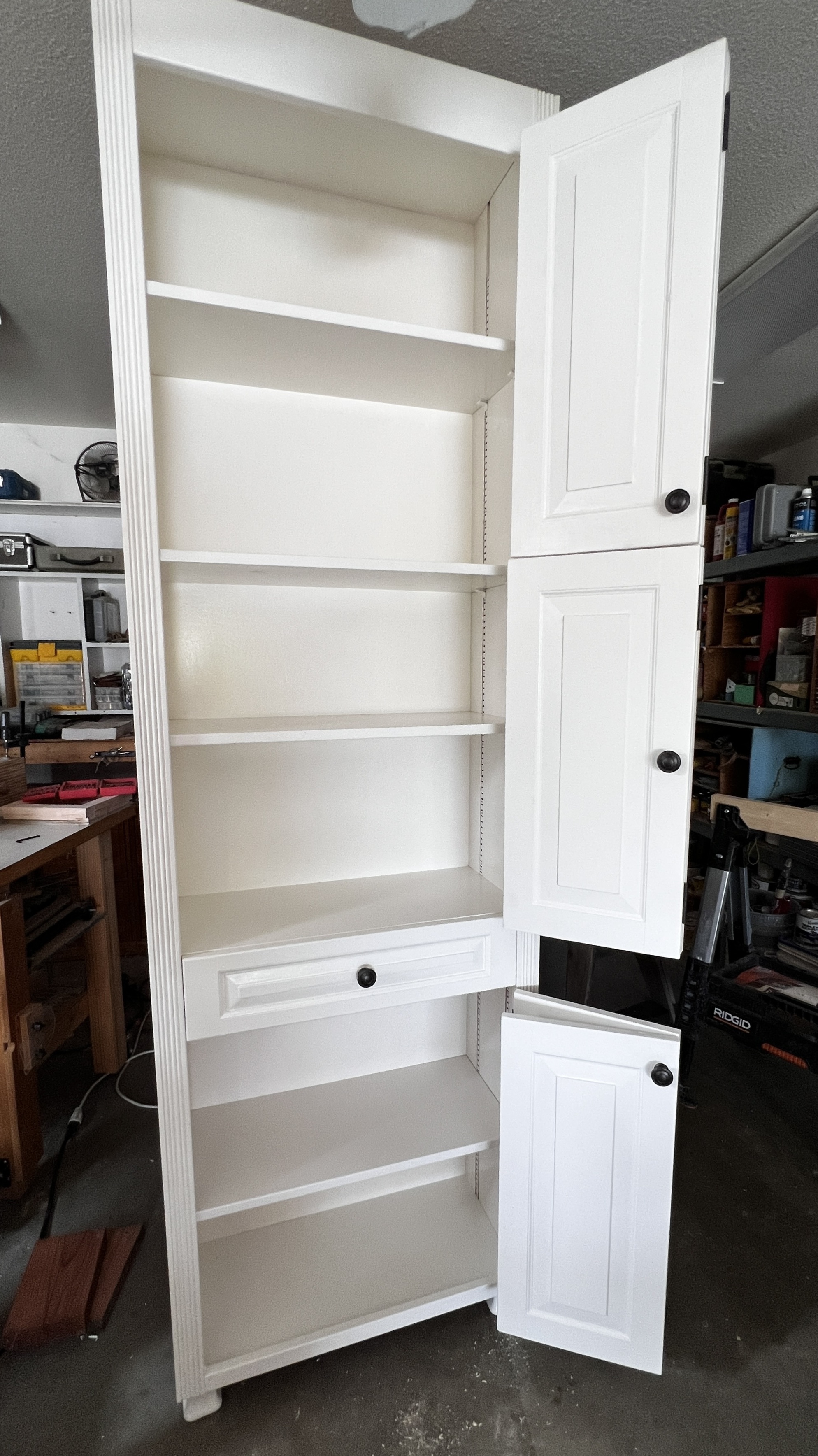 After examining the space and wanting to keep the windows uncovered, we decided on a 7 ½ foot tall free-standing cabinet with movable shelves and a drawer.