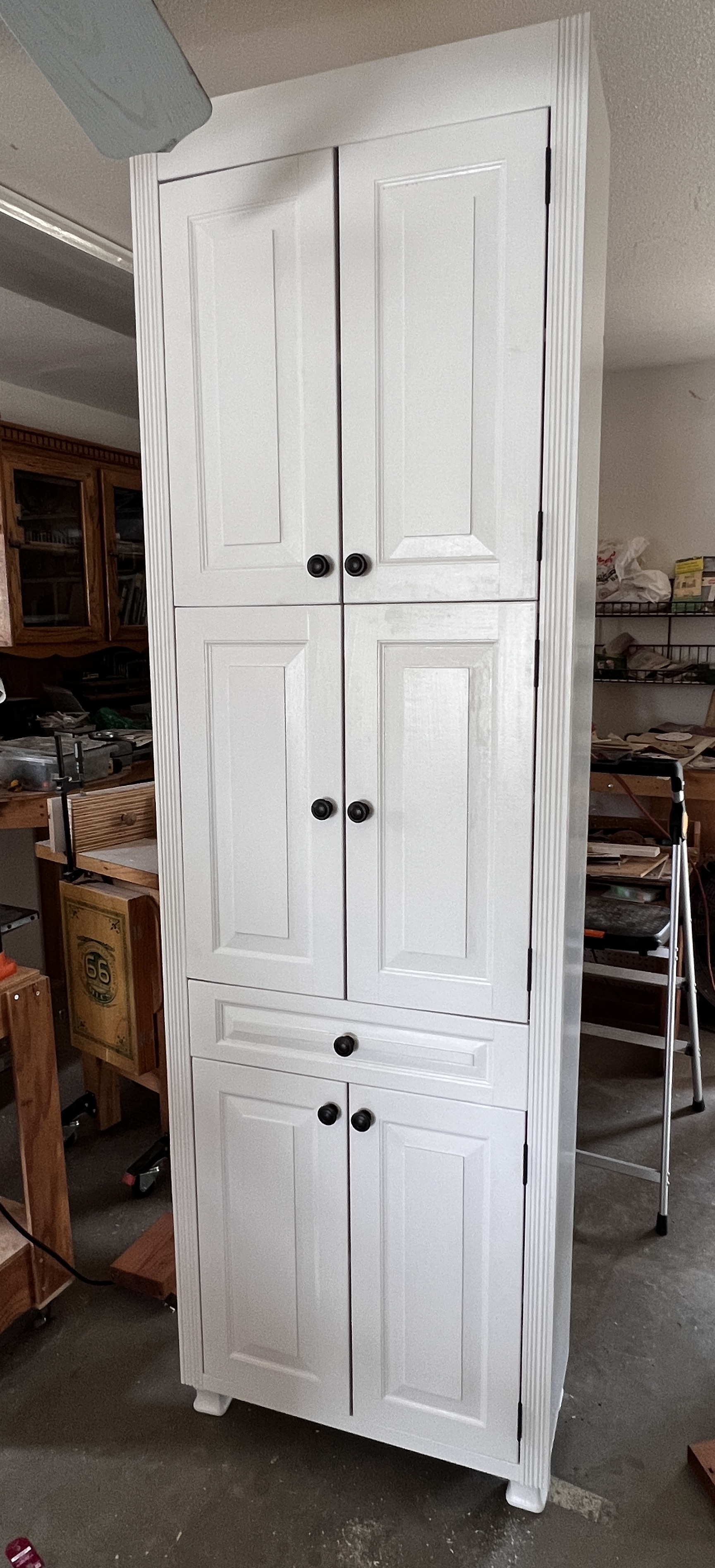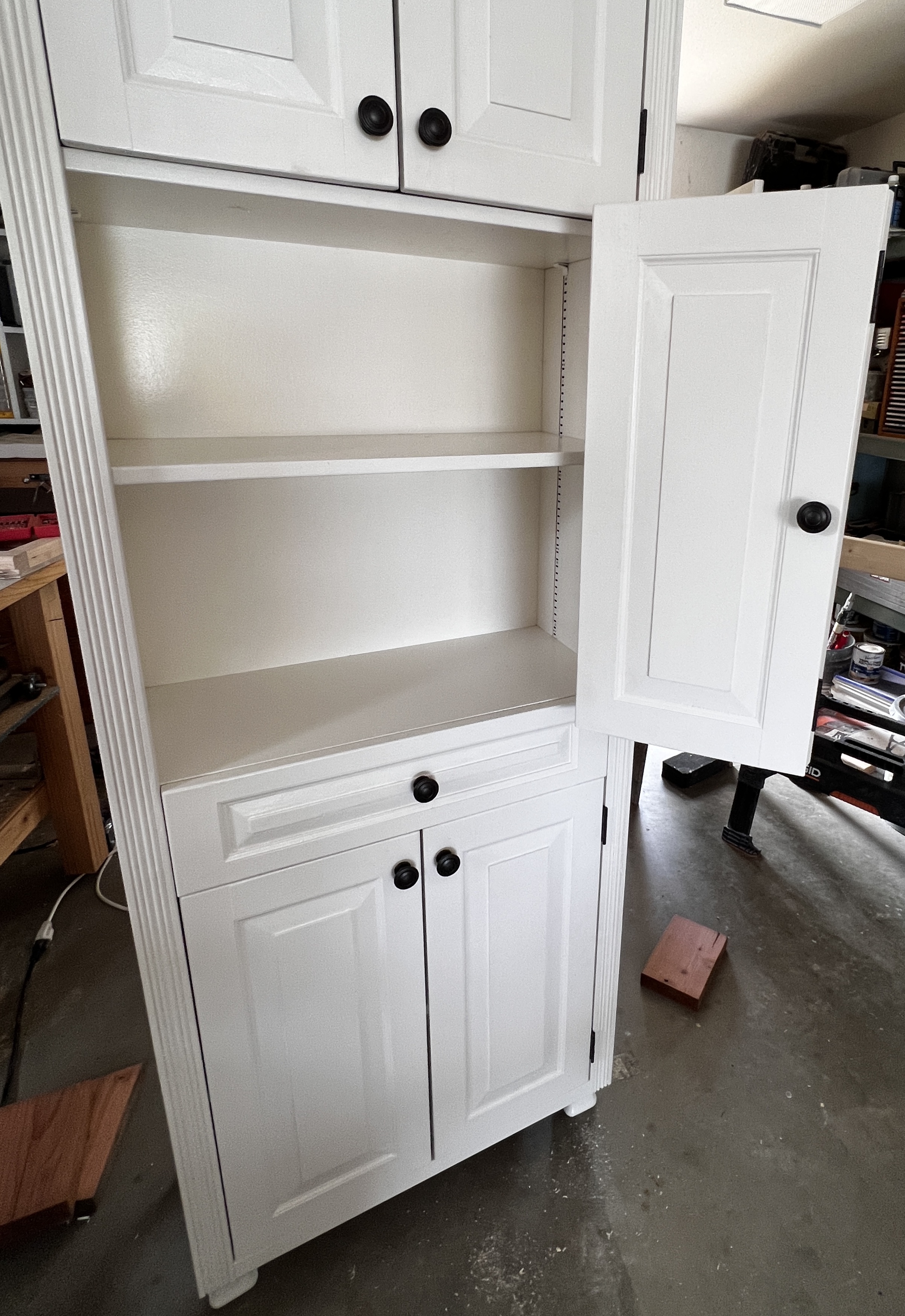 I was hoping to do everything in less than forty hours, but drawer, the painting and hardware installation took much longer than I expected. I now have a much better idea of how much each element takes. I am trying to estimate how much time per cubic foot; right now it appears to be 3½ to 4 hours. Without the jointer, that figure would be two to three times more.
