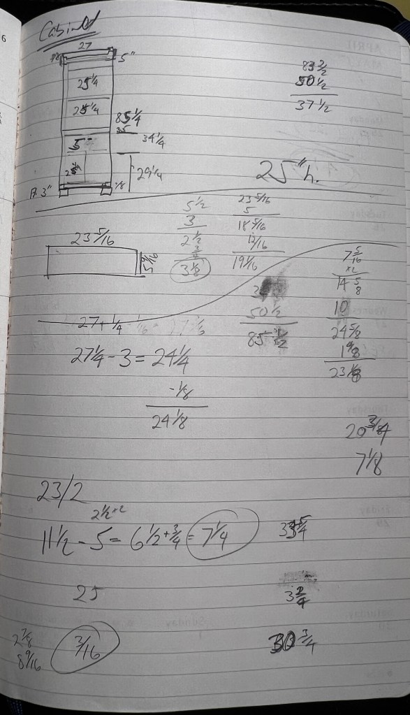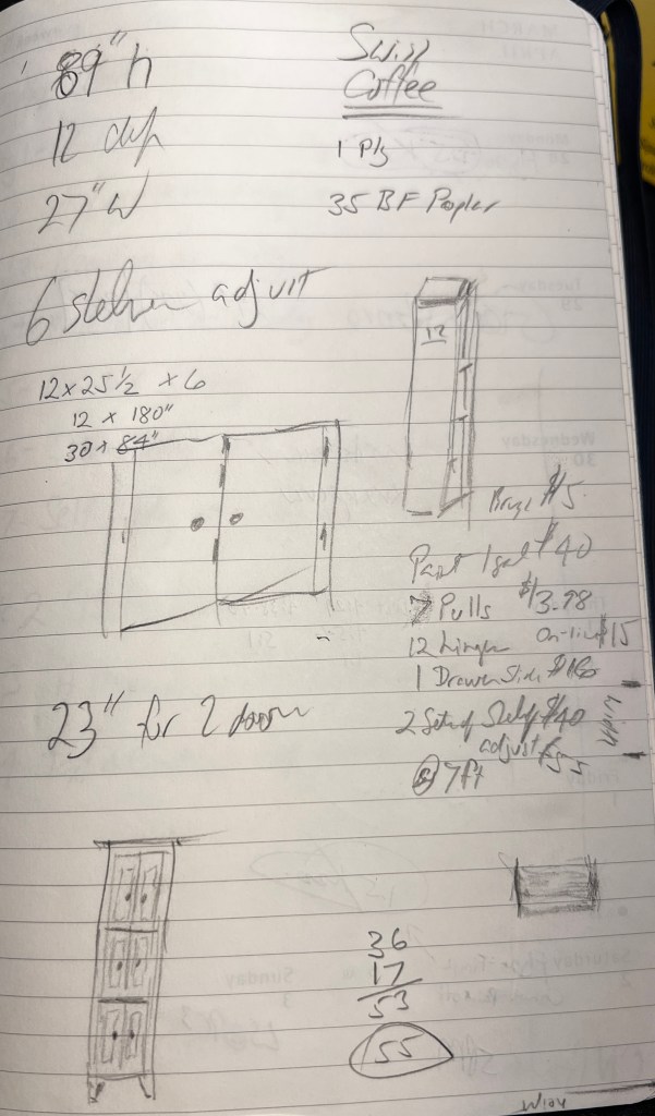The design for the cabinet tool several factors into consideration. The height accorded with the top of the window frame (89”) the width the space between the window and a room divider (27”) and a reasonable depth for the towels (12” total, 11 ¼ inside).