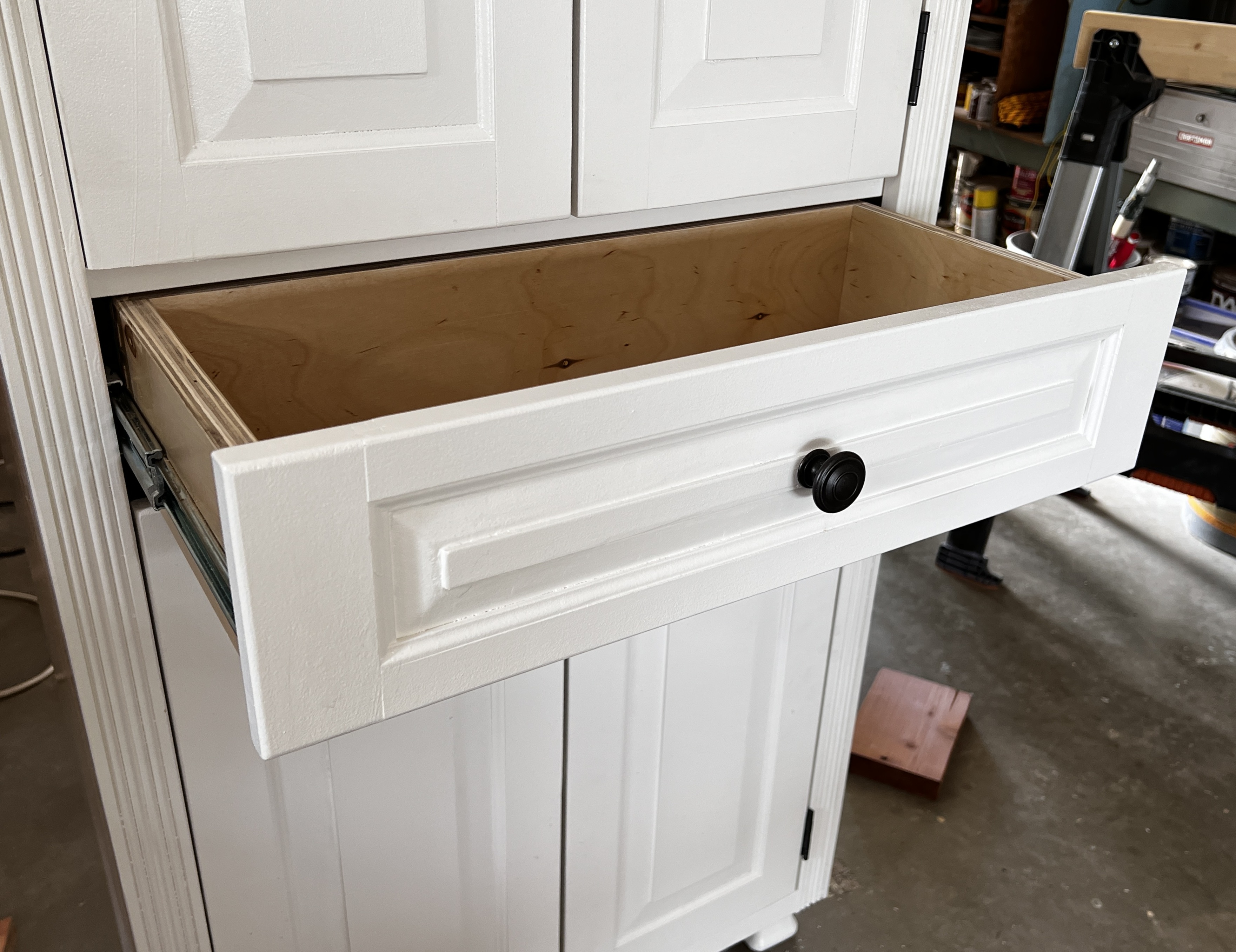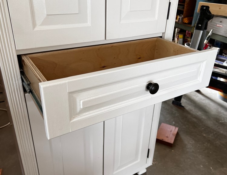 The drawer height and placement (5”x 24” front and 29”-34” vertical placement) was largely dependent on making all the doors the same height (two sets above the drawer and one set below). In any case, the drawer, like the doors close flush with the frame, and have dovetail construction with heavy slides on either side.